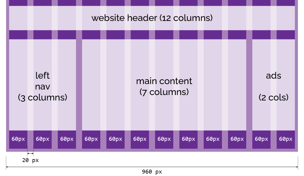 Fundamentally, a 12-column grid splits the page into twelve equally-sized columns, which creates a layout grid we can use to organise our content by specifying how many columns each element should occupy. Most versions you’ll see in the wild are based on a 960-pixel site width, with twelve 60-pixel columns, each surrounded by 10px of space, creating a 20px gap — known as a gutter — between adjacent columns.