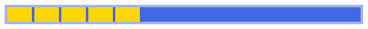 Say we have a flex container here, that’s 730 pixels wide, with 5px of padding and a 5px flex gap. There are five <div> elements in the container, with their flex-basis set to 50px. Initially, they don’t have a flex-grow property - or rather, they have the default flex-grow value, which is zero - so they only take up as much space as their content, and the container has a bunch of empty space at the end: